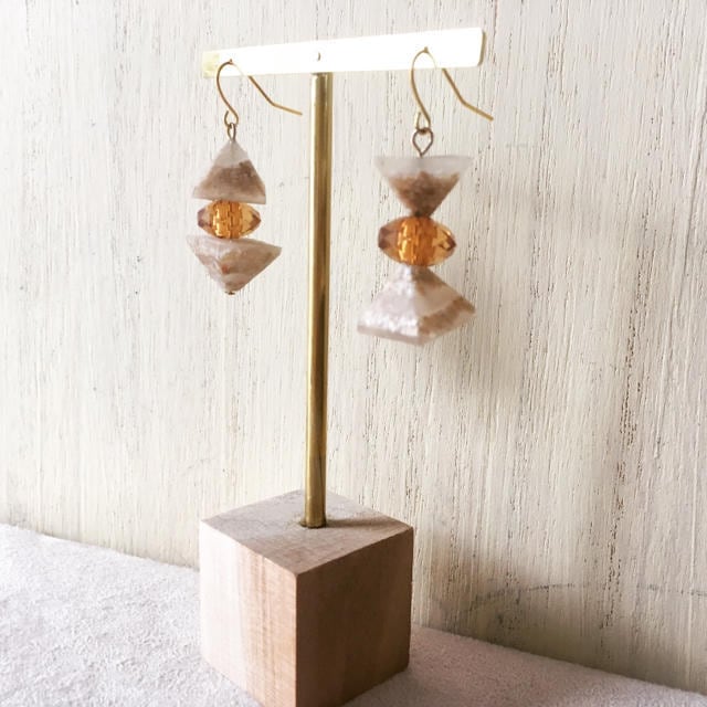 白いビーチの砂をボーダー状に閉じ込めたアシンメトリーピアスです 真ん中のクリアーブラウンのビーズはチェコビーズです ナチュラルなのに構築的なデザインです ※商品はひとつひとつ手作業で作っています。ゆがみ・色むら・小さな繊維が入り込んでいる場合があります。手作りの品であることをご理解の上ご検討ください。 全長 約4cm 片側のみの重さ 約3.7g