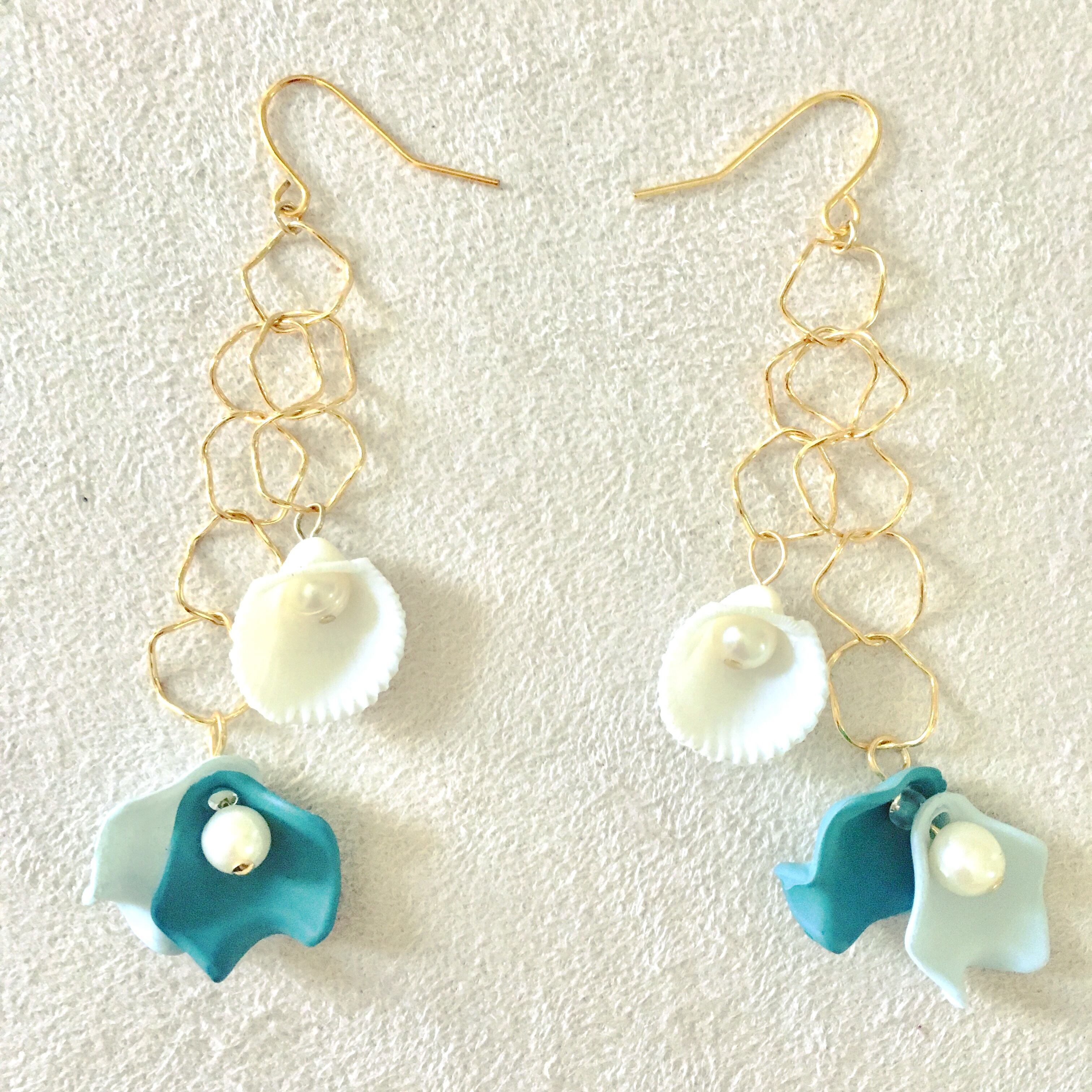ゆうらり、ひらひらしたなチェーンとパーツを使ったスウィングピアス 水芭蕉とかスズランとか涼しげでみずみずしさを感じるお花をイメージして作りまし た とっても優しい雰囲気のピアスです シェルと花びらパーツの先についているのは淡水パール 花びらは左右カラーを互い違いにし、リズム感や立体感を出しました チェーン自体が反射して華奢なのに存在感があります 全長 約7.5cm 片側のみの重さ 約1.7g