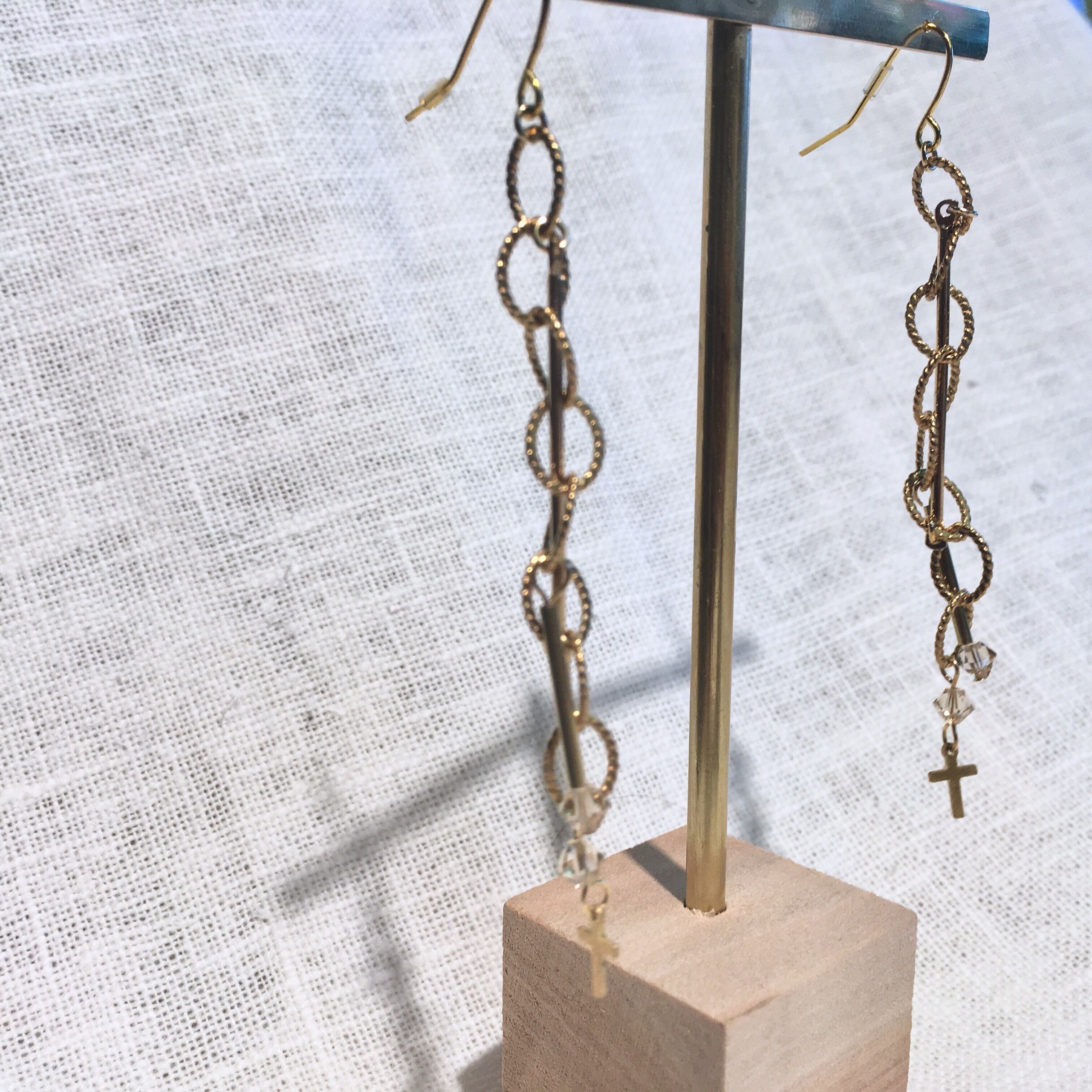 アンティークゴールドのチェーンに途中まで芯を入れてカクカクさせました パイプの先についたチェコビーズはベージュとピンクの2種類でさりげない輝きがアクセントに 芯から解放された先のほうは自由に揺れ、その相反する動きが面白いです ※1〜3枚目がベージュ、4、5枚目がピンクビーズになります ※4、5枚目はイヤリングパーツに付け替えた例です(+100円) こちらのページで追加パーツを購入されない場合は1〜3枚目のようなフックピアスになります