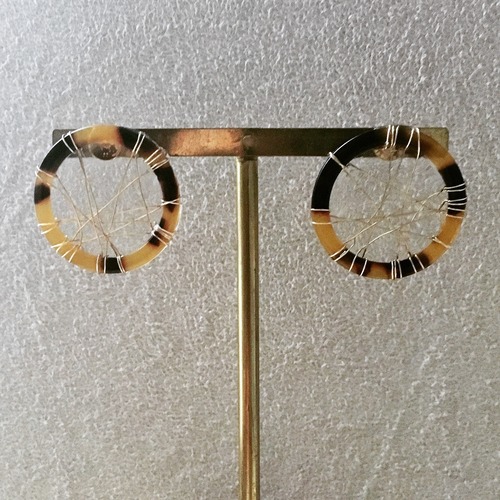 細いゴールドのアーティスティックワイヤーをランダムに巻きつけ、ルチルクォーツ風に見立てたピアス ゴールドの線がさりげなく光る、取り入れやすいシンプルなデザイン ワイヤーは樹脂コーティングされているので髪に絡まりません 揺れるのが好きでない方にオススメの品です 直径 約2.8cm 片側のみの重さ 約1.9g