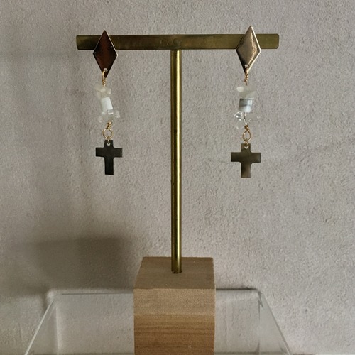 普段使いから結婚式などオケージョンシーンでも使えるシンプルかつ華やかなピアスシリーズ さざれ石の上側はムーンストーン、下側はクリスタルを使用しています 十字架モチーフは黒蝶貝をくりぬいたもの ゆらゆら揺れることで偏光に光ります 色を抑えたことでどんなシーンにもマッチしやすい上品な雰囲気です 全長 約5cm 片側のみの重さ 約1.4cm